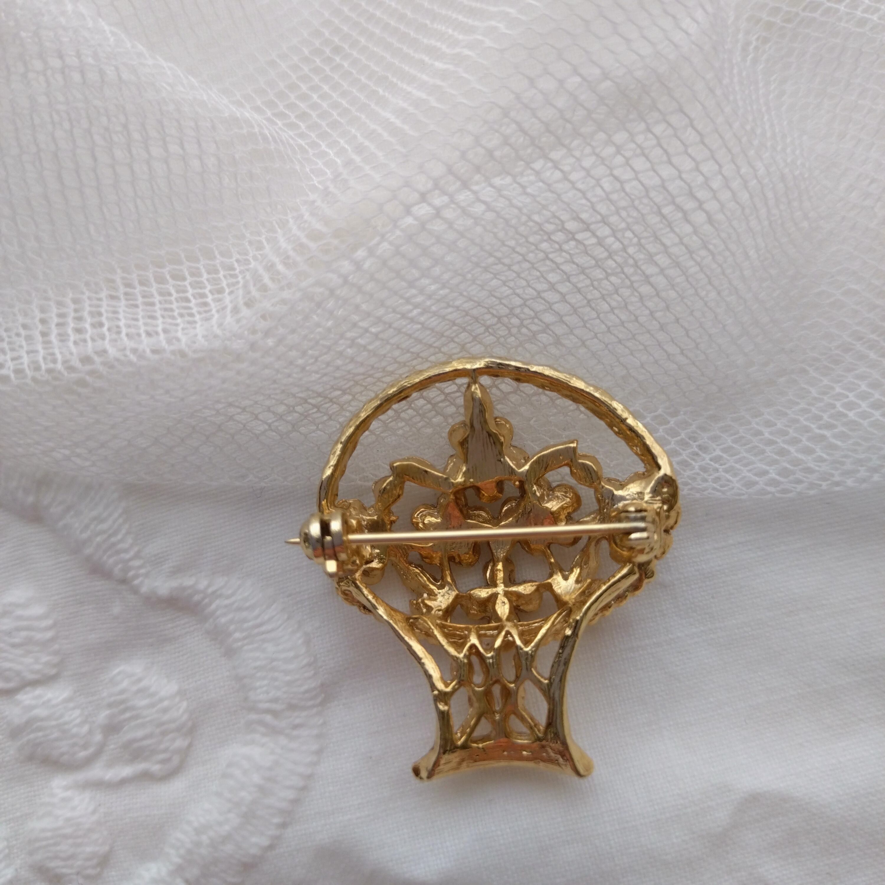 可愛らしい花籠が美しくデザインされたヴィンテージブローチです。こちらのフラワーバスケットは、上品なデザインとクラシカルな魅力を放っています。さりげなくもおしゃれなアクセントとして、様々なスタイルに合わせてお使いいただけます。