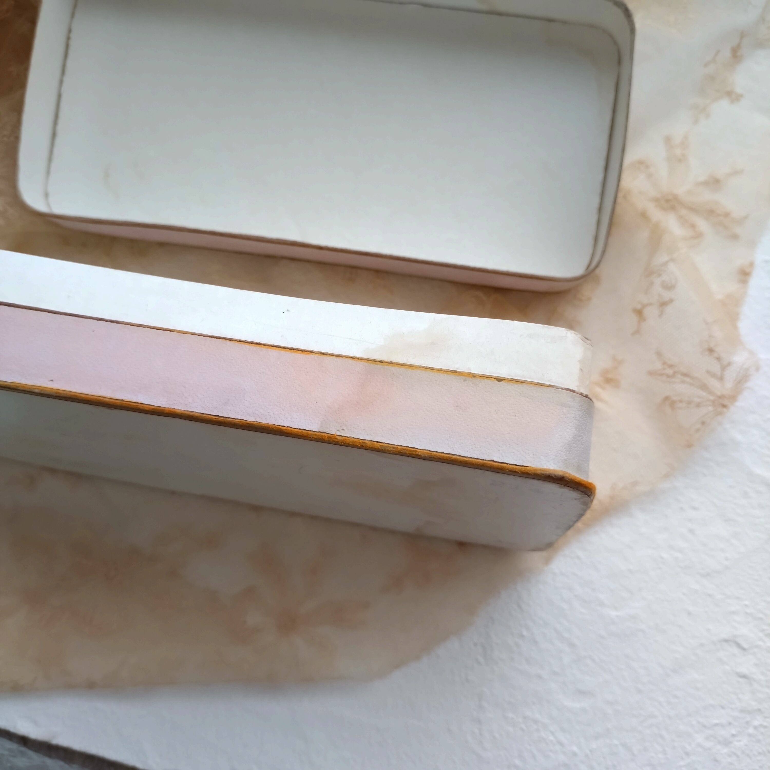 側面にシミが見られ、蓋の部分には経年劣化によれ多少のシミが見られます。