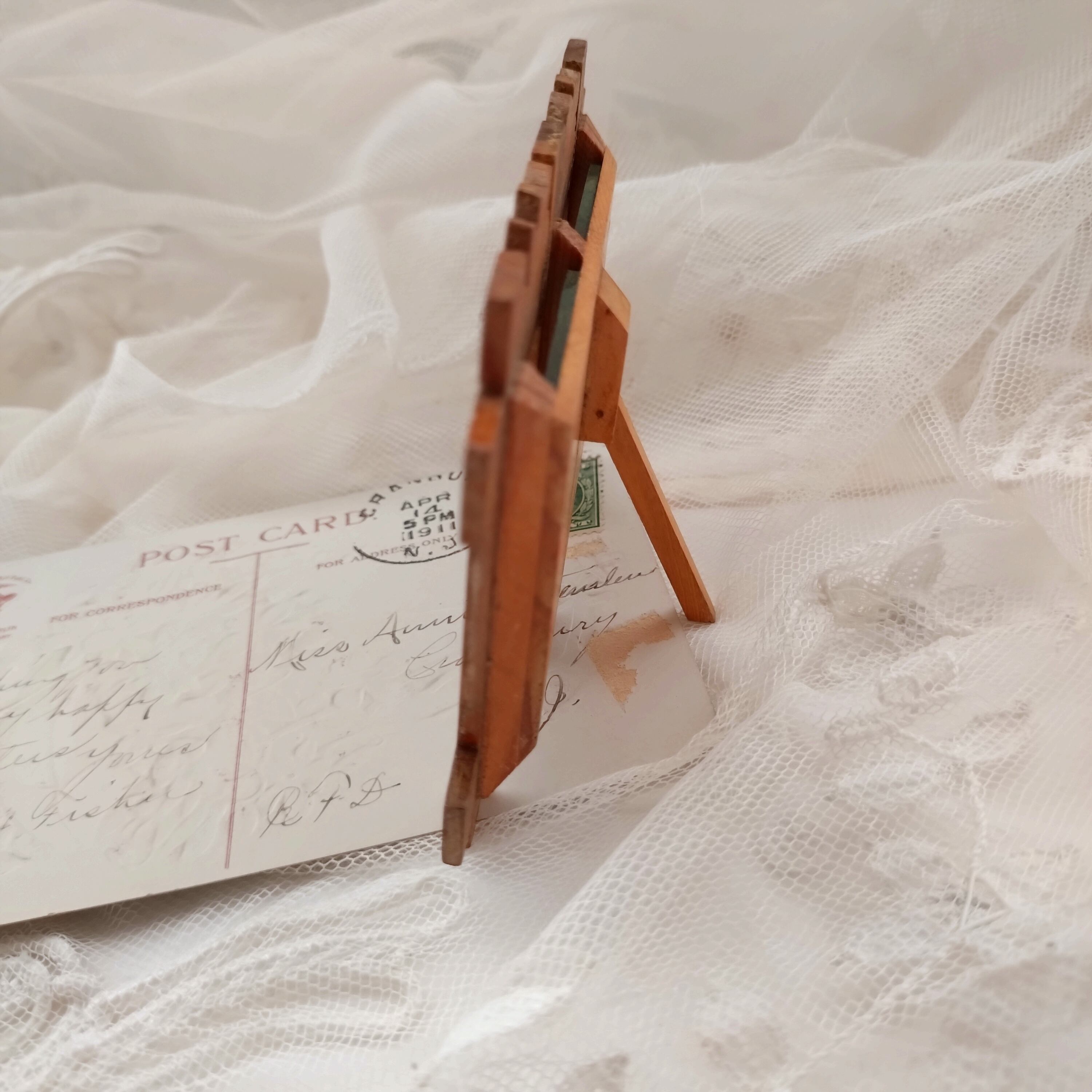 フレームの上から小さな写真やクロモスなどを入れることができ、裏側のスタンドを広げて、立てられます。