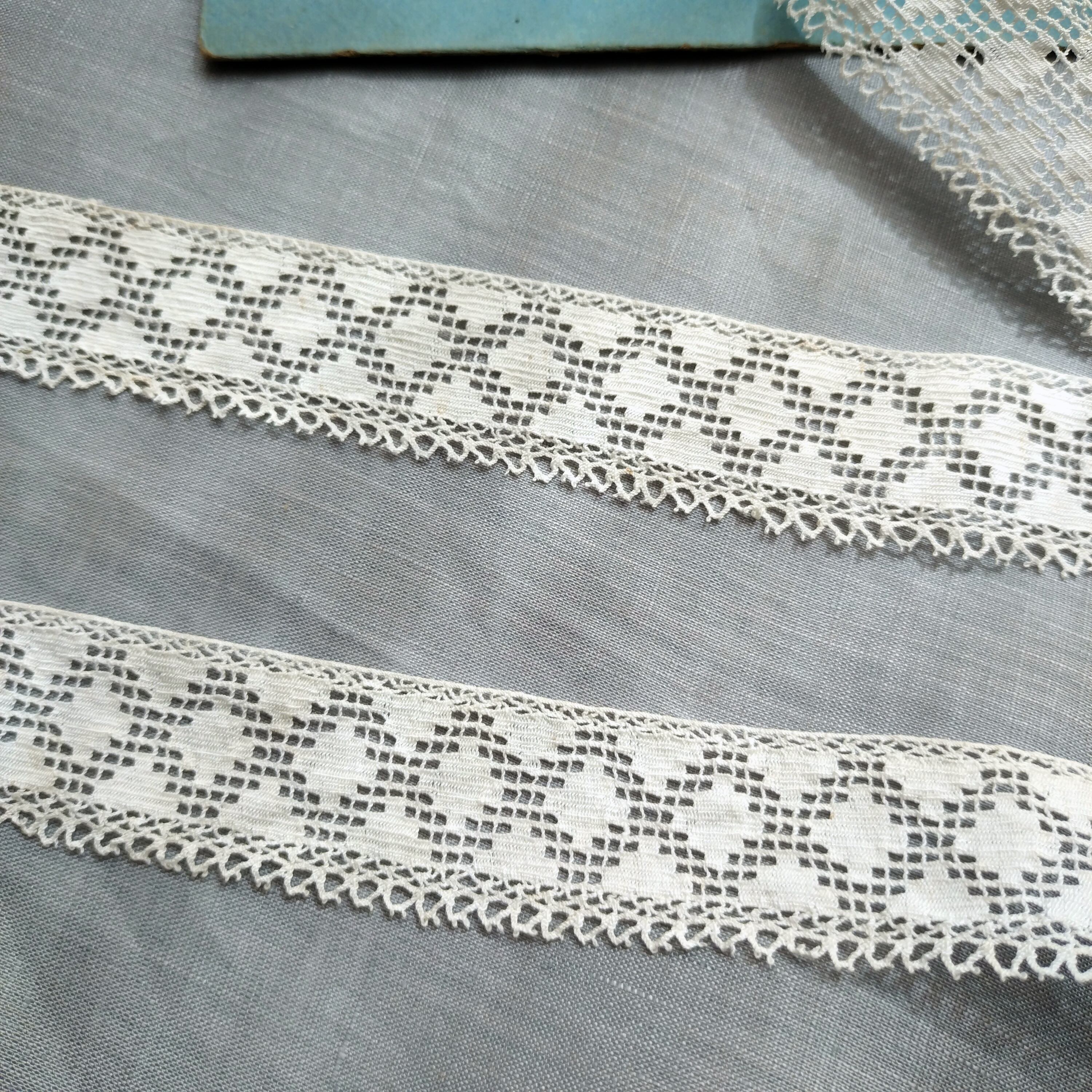 フランスの魅力を感じさせるこの幾何学模様のレースは、楽しいデザインが特徴のアンティークアイテムです。デザインは遊び心満載で、あなたのクリエイティブな発想を刺激することでしょう。