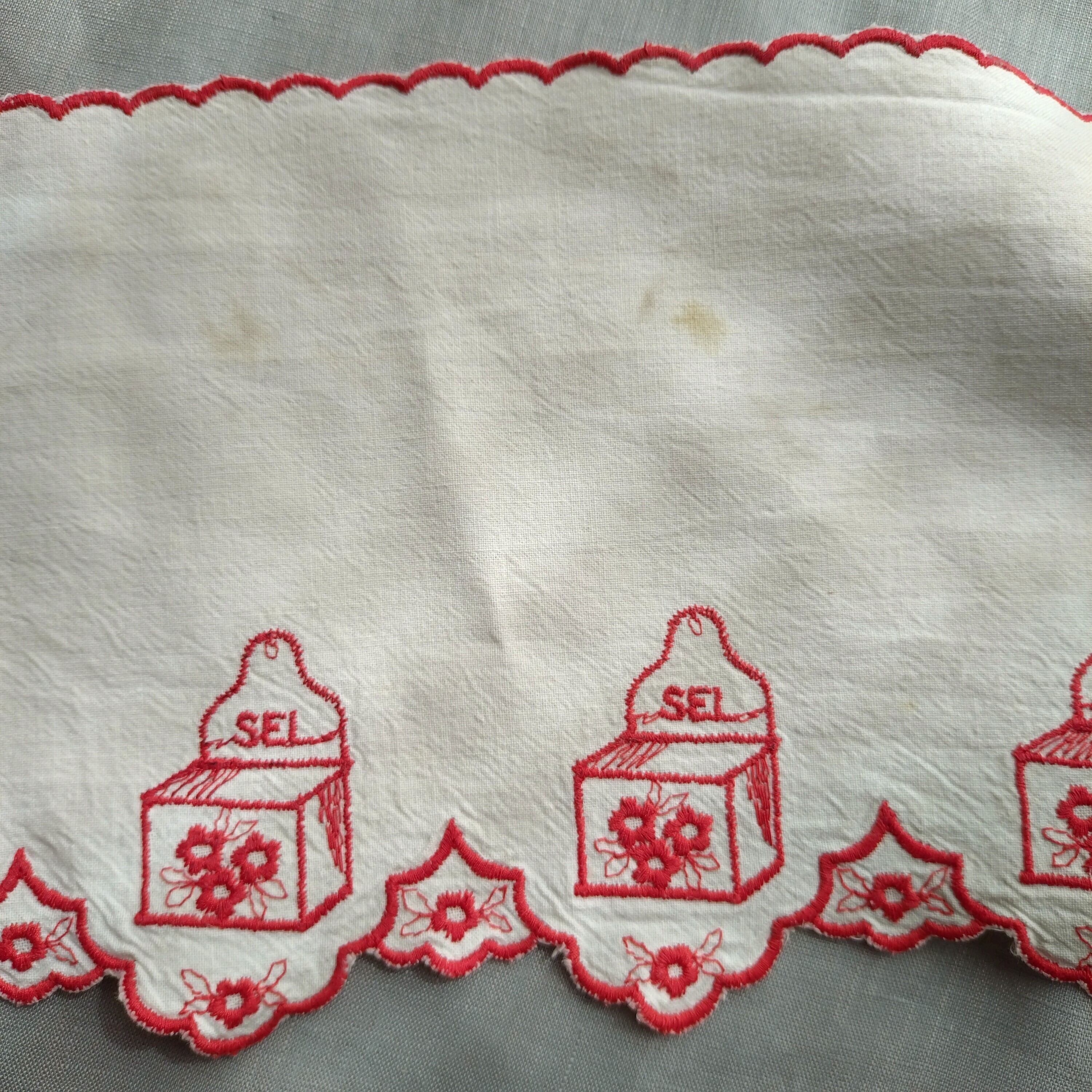 ほっこりとしたデザインが魅力のこのアンティーク棚飾りは、フランスの優れた職人技を感じさせる特別なアイテムです。刺繍のモチーフがフランス語で「塩」と書かれており、どこか愛らしさを感じさせます。赤いカラーは元気を与えてくれ、インテリアに華やかさをプラスすることでしょう。