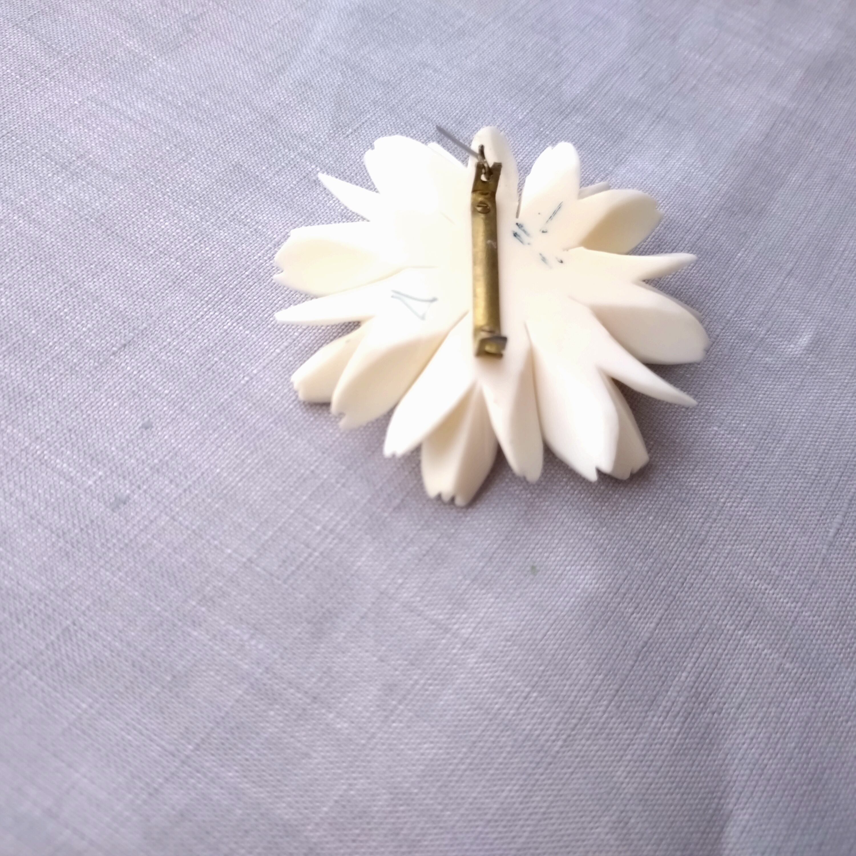 このブローチは、セルロイド製の美しいマーガレットデザインが特徴です。花弁の動きやがくの繊細な表現が施されており、可愛らしさが際立ちます。特別な日はもちろん、普段のコーディネートにも華やかさをプラスするアイテムとなっております。