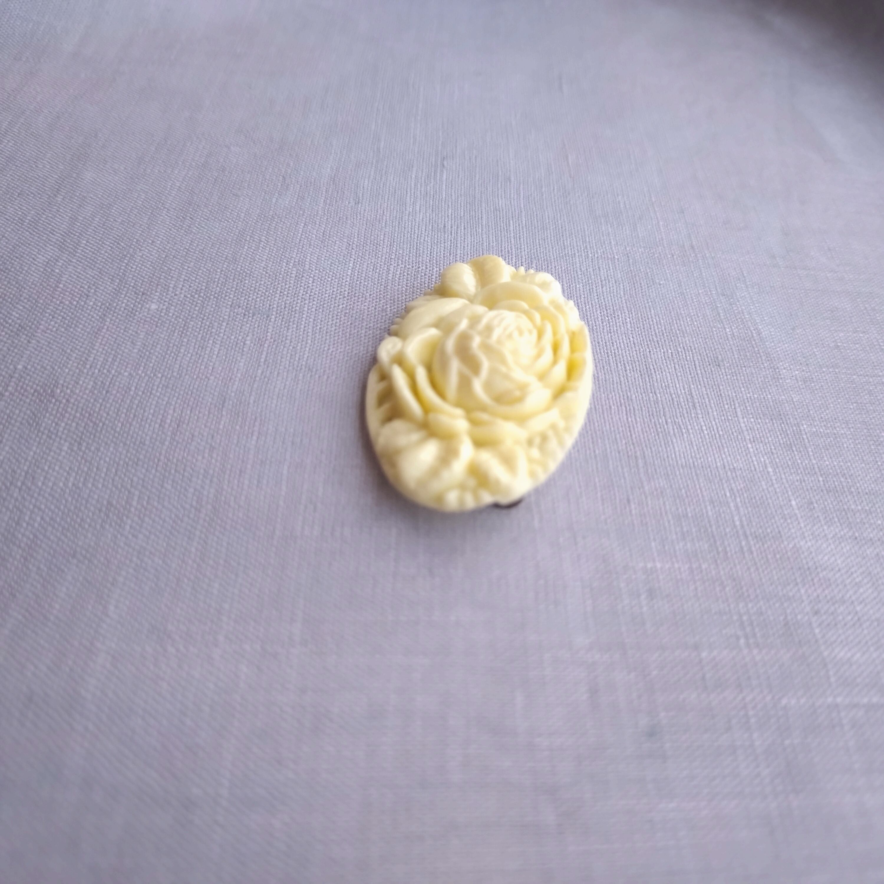 このブローチは、セルロイド製の美しいローズデザインが特徴です。バラの表現が素敵で、一つ一つの花びらのディテールが際立ち、どんな装いにも華やかさをプラスするアイテムとなっています。特別な日のお洒落にはもちろん、日常のコーディネートにもぴったりです。