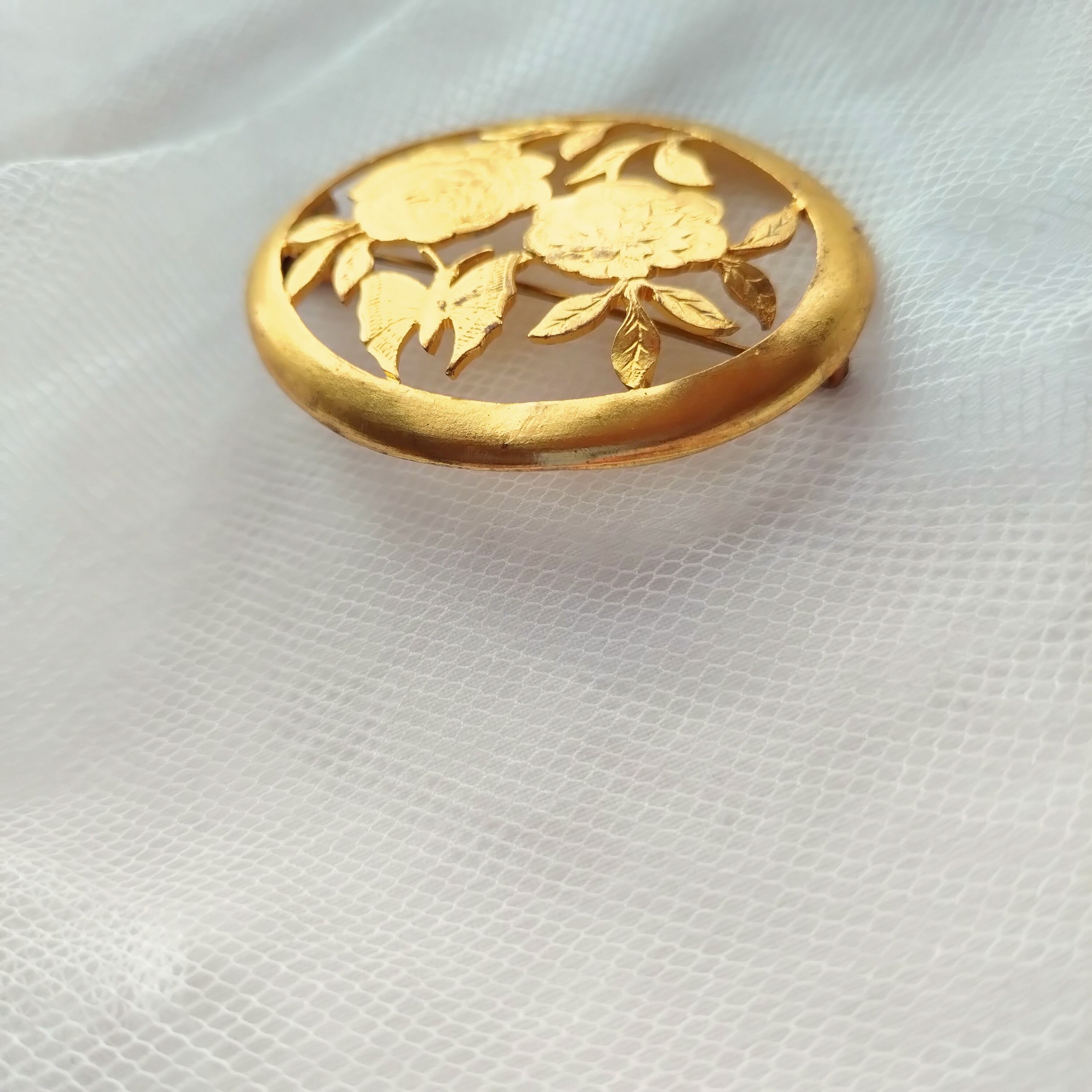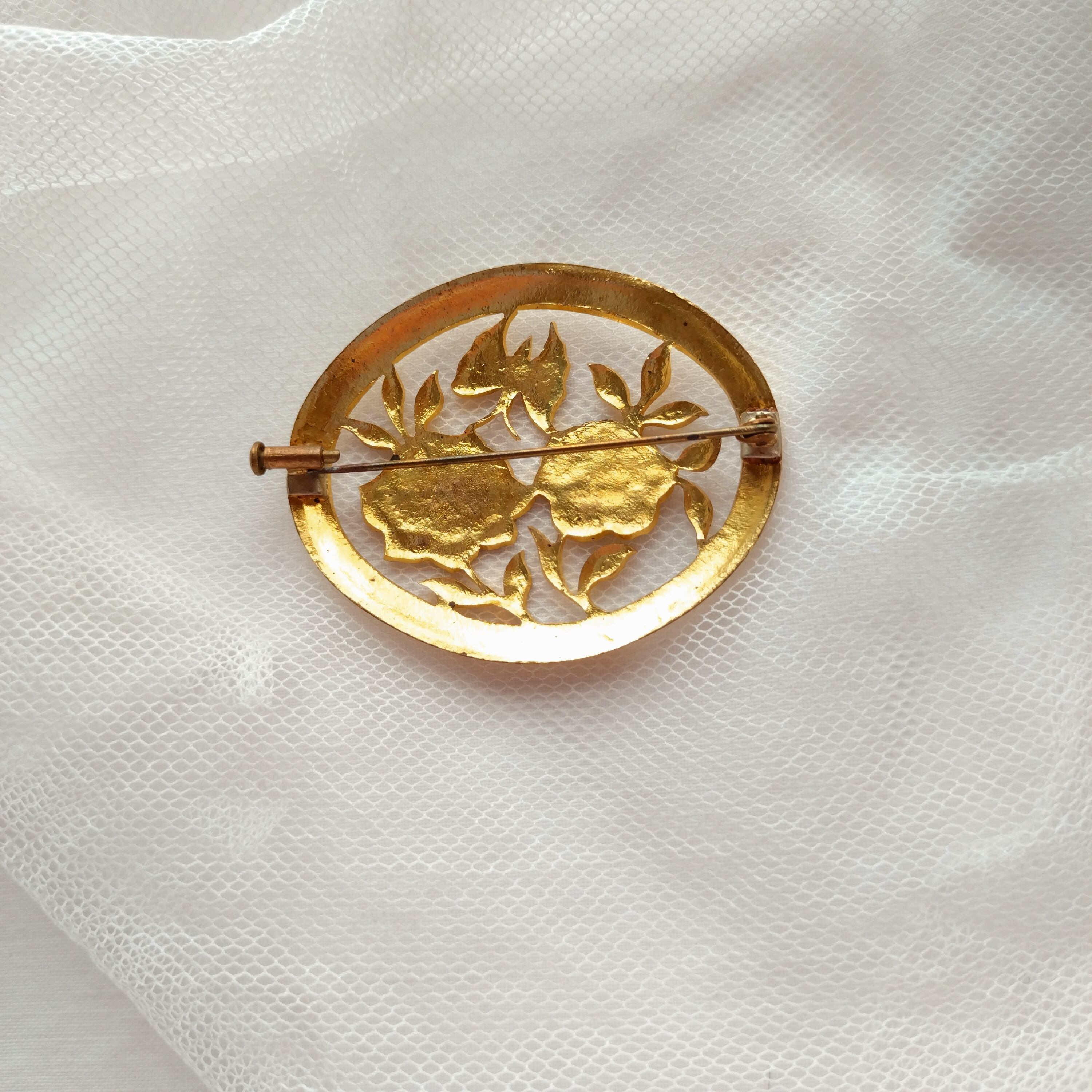 フランスからの特別なデットストックアイテムです。薔薇と蝶々の美しいデザインカットが施されており、見る人の心を魅了します。未使用ですが、経年によるクスミなどが見られることがございます。またブローチ側面枠右下に歪みが見られます。その独特の雰囲気が、このブローチに愛着を与えることでしょう。お色違いでシルバーもございます。